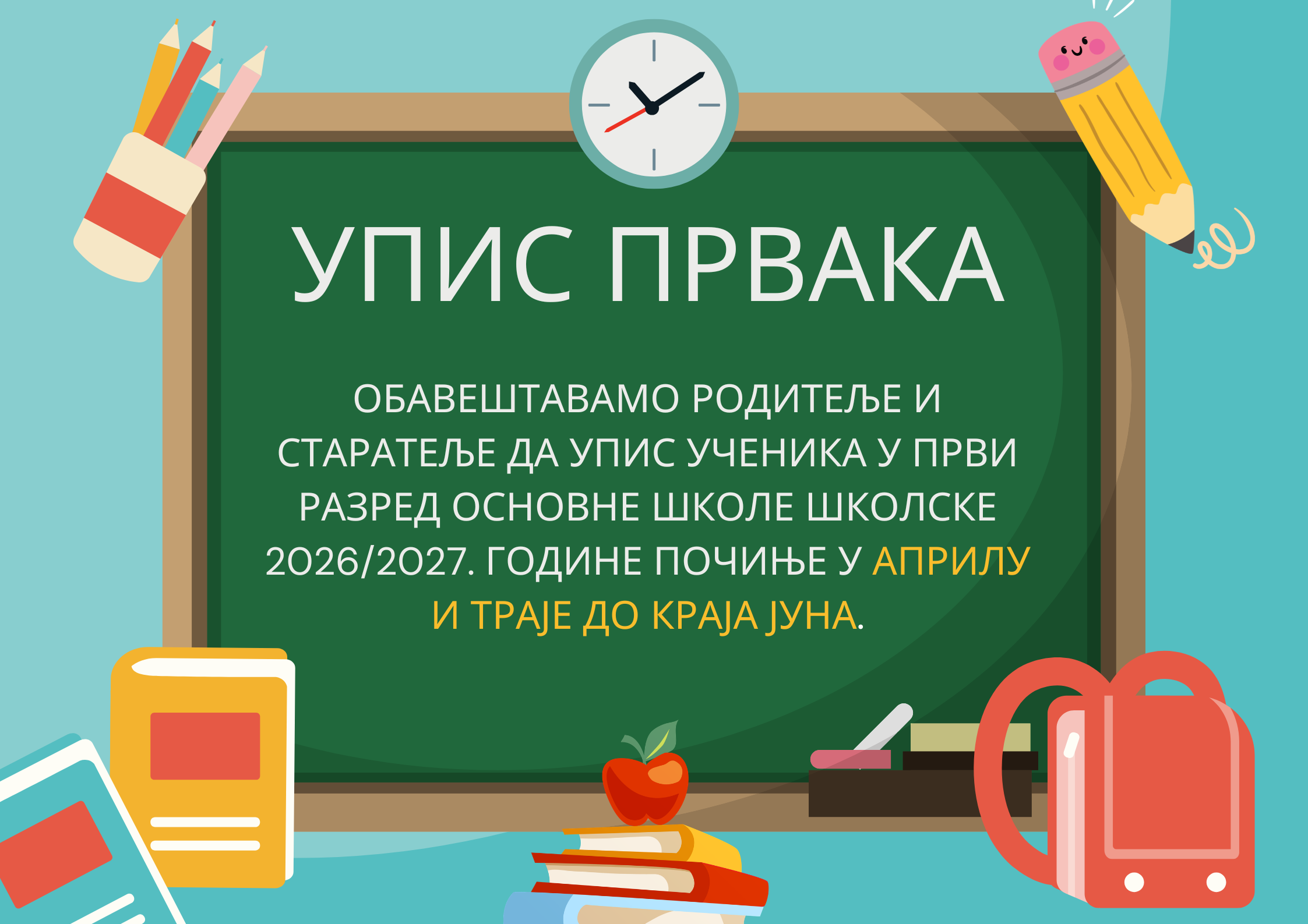 Од 24.03.2026. године, на Порталу еУправа биће доступна услуга еЗаказивање термина ( https://euprava.gov.rs/usluge/5867 ) за упис и тестирање (омогућиће вам да једним доласком у школу завршите све активности у вези са уписом детета у школу).